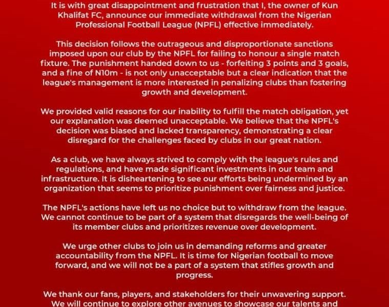 Kun Khalifat FC have announced their withdrawal from the Nigeria Premier Football League (NPFL) following sanctions imposed on the club for failing to honour a league...
