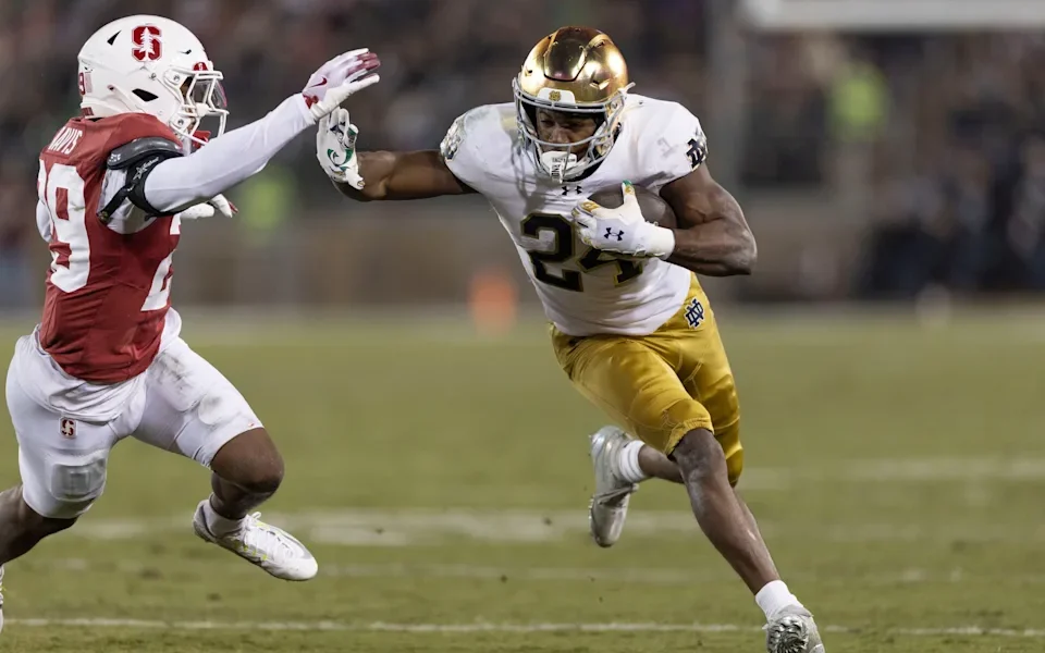 Film Profile | Analytical Profile Nov 29, 2025; Stanford, California, USA; Notre Dame Fighting Irish running back Jadarian Price (24) runs with the football against Stanford...