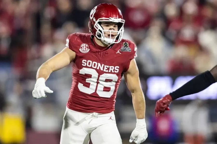 Dec 19, 2025; Norman, OK, USA; Oklahoma Sooners linebacker Owen Heinecke (38) against the Alabama Crimson Tide during the CFP National Playoff First Round at Gaylord...