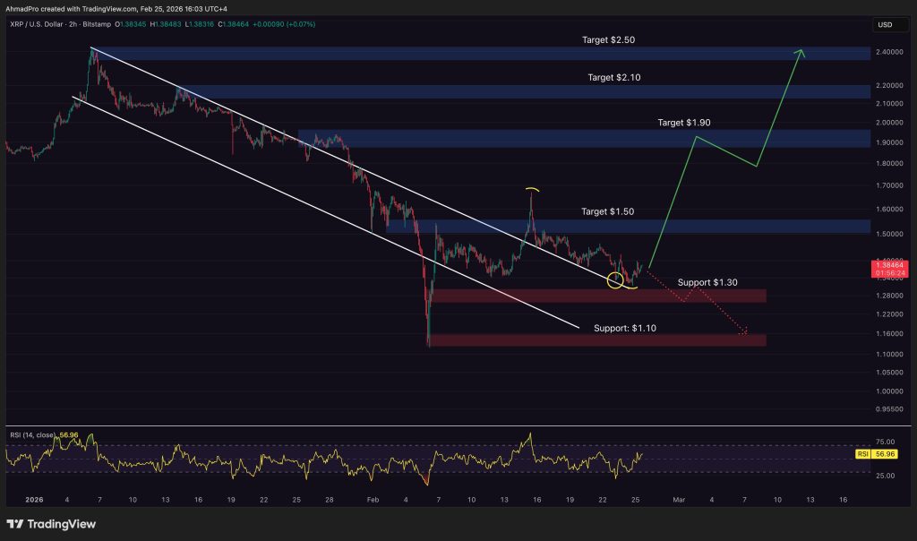 As long as XRP prints higher lows above $1.30 and holds outside the channel, the short-term bias stays constructive.