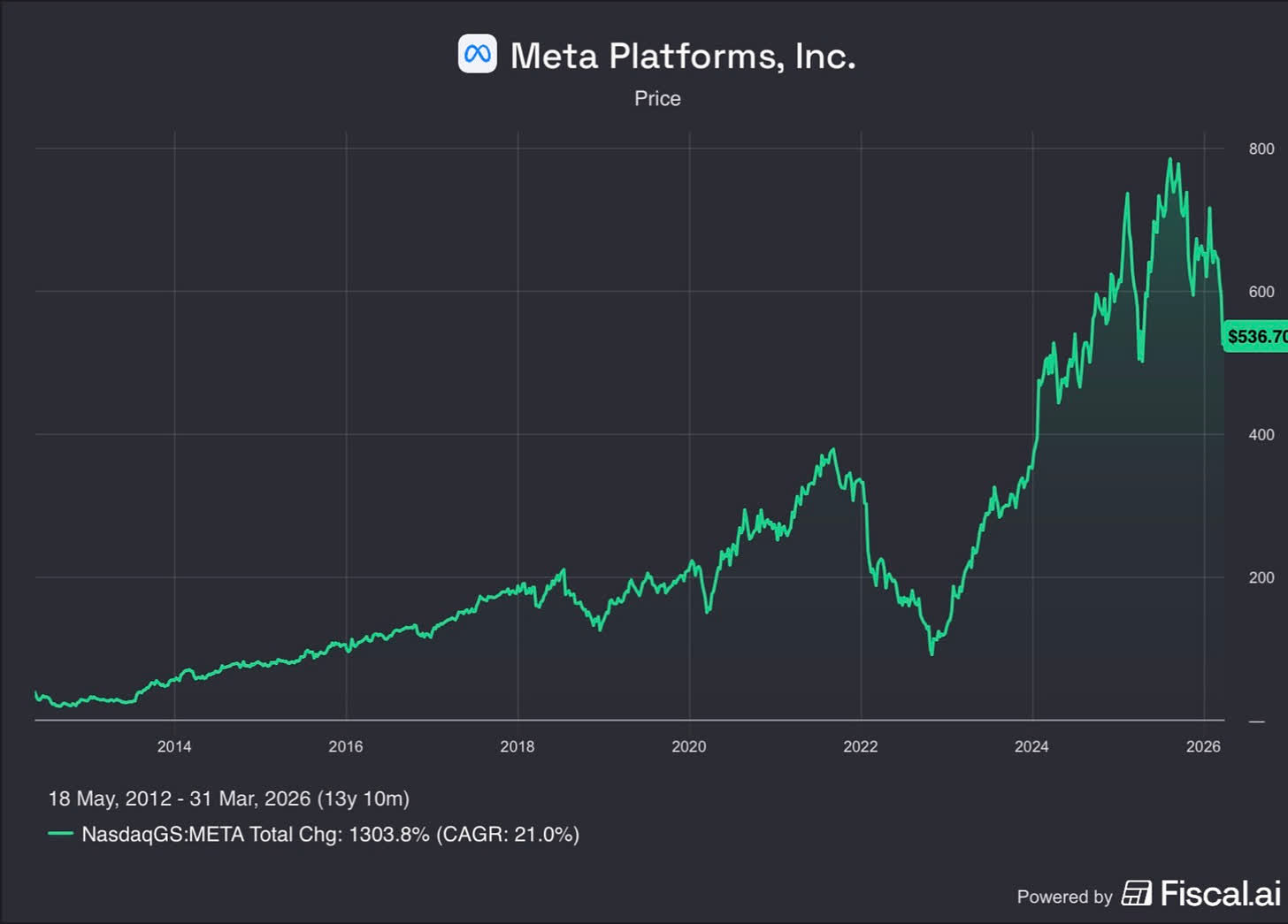 Meta has delivered a cumulative return of approximately 1,300% since its IPO, or about 21% annually. The path to those returns, however, has been anything but smooth.