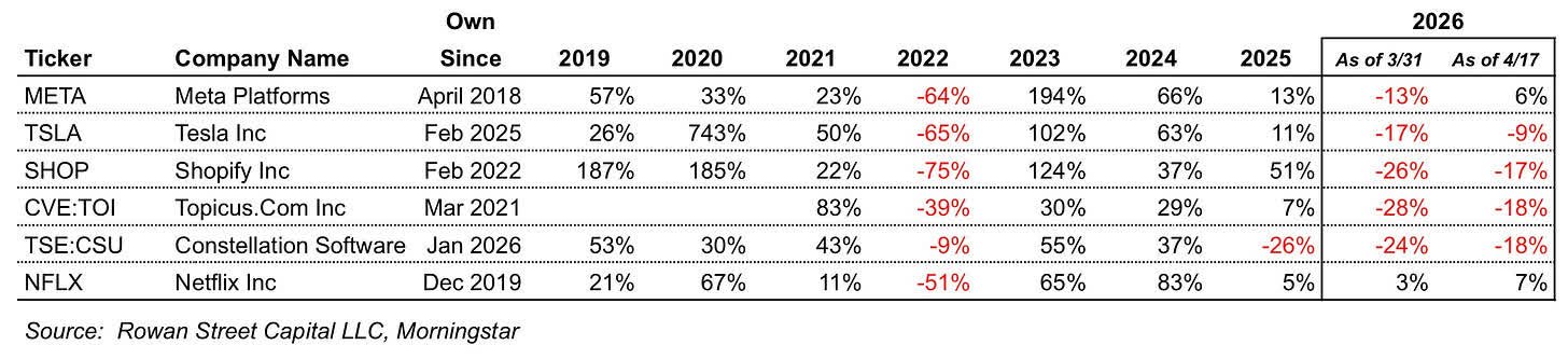 The table below shows the annual returns of our largest holdings by portfolio weight as of March 31, 2026 and illustrates a simple reality of long-term investing: even exceptional businesses experience significant volatility. We have included an April 17 column to reflect the meaningful recovery in our portfolio since quarter-end, as discussed in the Performance section above. The figures reflect annual stock price returns and do not represent Rowan Street Capital fund performance or returns achieved by the fund on these positions.