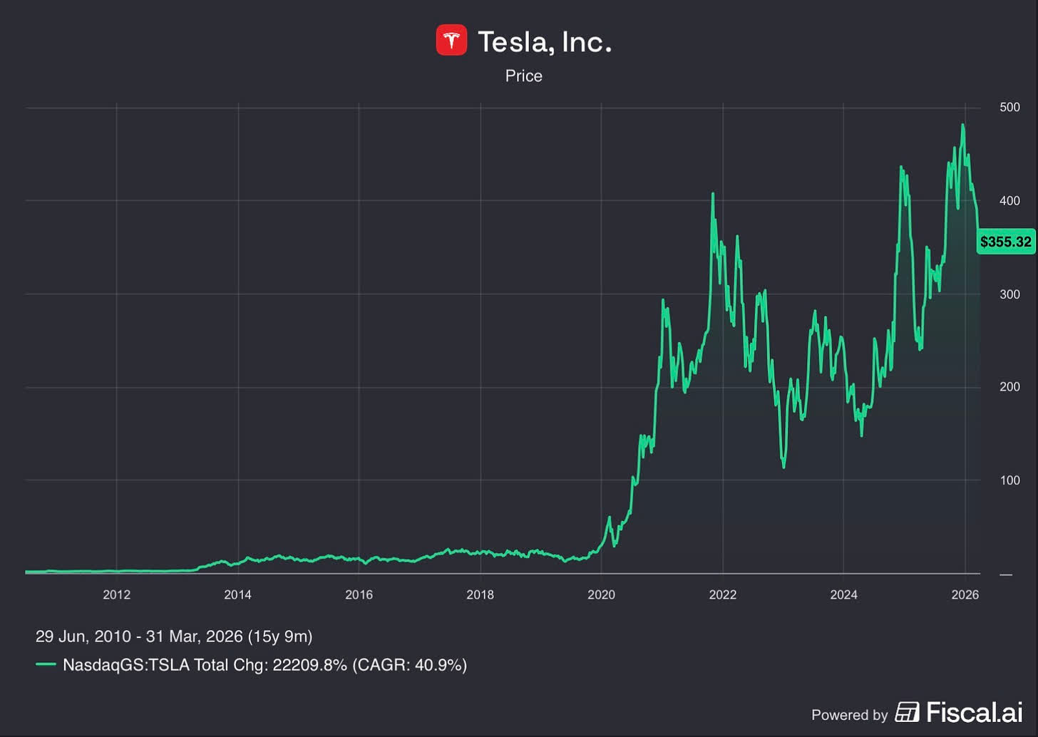 Tesla provides an even more striking example—not just of volatility, but of how disproportionate long-term outcomes can be relative to the experience along the way.