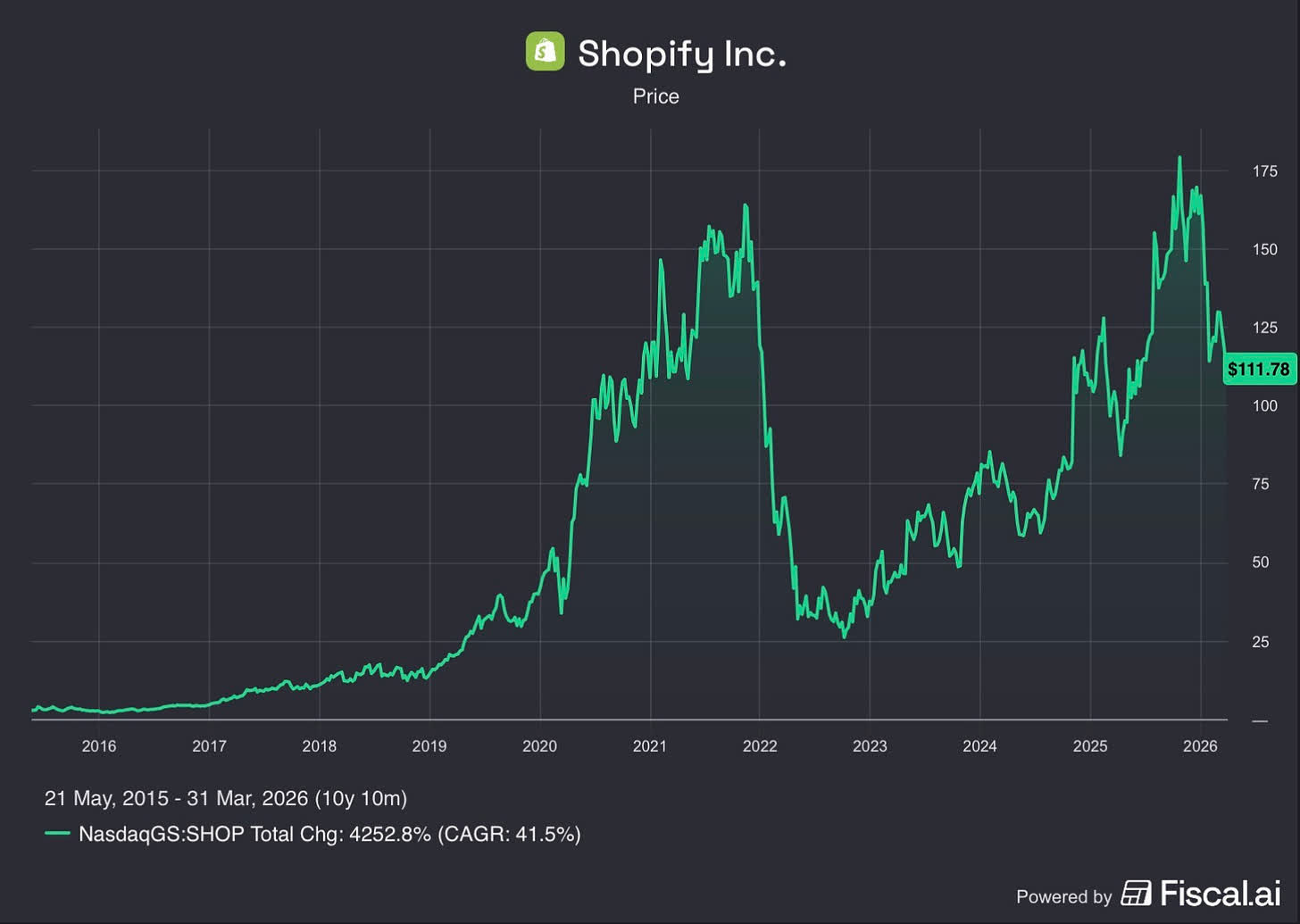 Shopify has been an exceptional business over time, compounding at over 40% annually since its IPO.