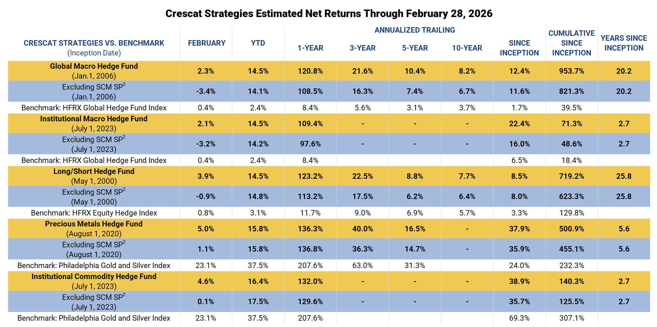 Performance data represents past performance, and past performance does not guarantee future results. Performance data, including Estimated Performance, is subject to revision following each monthly reconciliation and/or annual audit. Individual performance may be lower or higher than the performance data presented. The currency used to express performance is U.S. dollars. Before January 1, 2003, the results reflect accounts managed at a predecessor firm. Crescat was not responsible for the management of the assets during the period reflected in those predecessor performance results. We have determined the management of these accounts was sufficiently similar and provides relevant performance information.