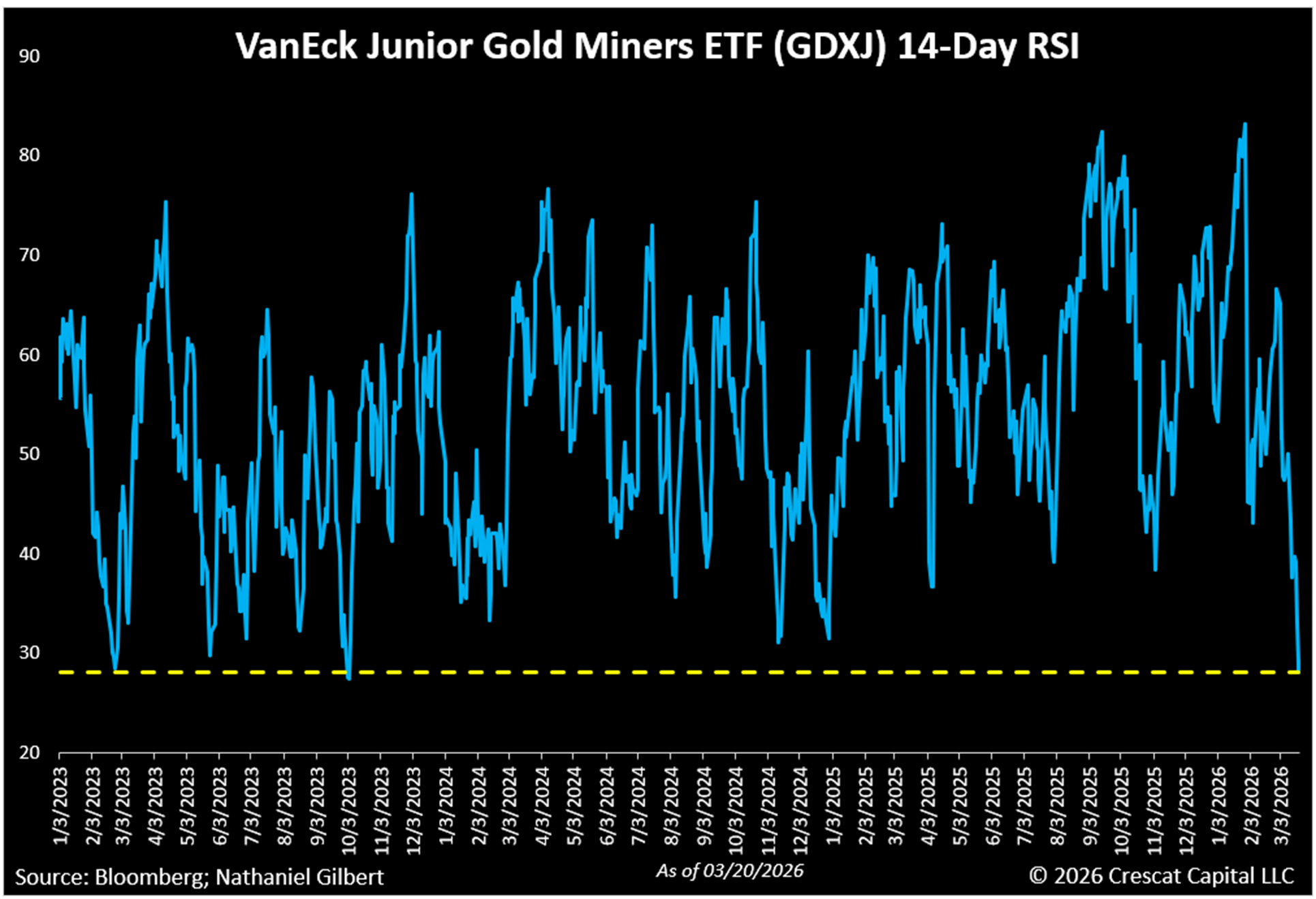 Both the GDX and GDXJ ETFs have 14-day Relative Strength Index (“RSI”) readings below 30, a level typically associated with oversold conditions suggestive of a potential for a near-term rebound. Note, the last two times GDXJ 14-day RSI was sub 30 in March 2023 & October 23, there was a 34.6% and a 27.9% rally, respectively, within just two months. For an industry that just led the entire stock market in 2025, such a sharp rebound would not surprise us at all.