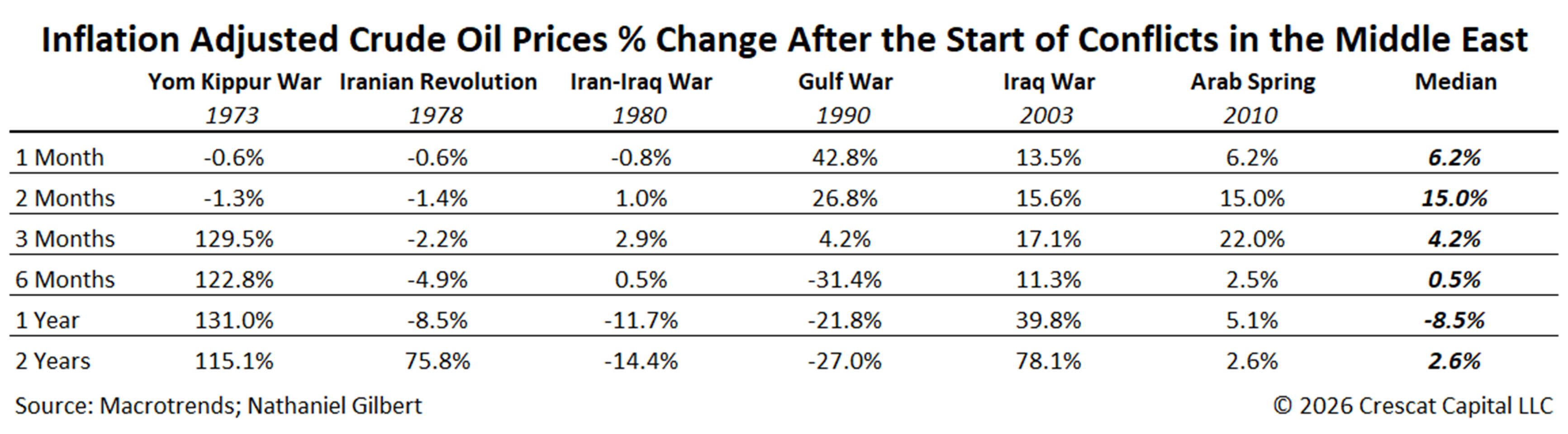 We have shown that higher oil prices do not mean that metal prices cannot go even higher. At this stage, however, the ultimate effect of recent geopolitical developments on the long-term path of oil prices remains unclear. The US is the largest oil-producing country in the world today and is now a net exporter, unlike in the 1970s when it was dependent on Middle East oil. Although the market has understandably responded to the risk of higher energy costs, it is too early to conclude whether the current move in crude reflects a lasting shift in fundamentals or a shorter-term geopolitical premium. To provide perspective, the table below illustrates the inflation-adjusted percentage change in crude oil prices following the onset of past major Middle East conflicts over various time horizons.