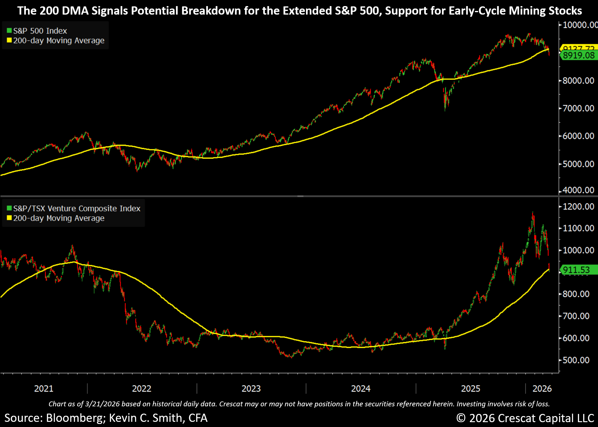 Interestingly, both mining stocks and the large cap indices are near their critical 200-day moving average support and resistance levels, but the two groups have highly divergent valuation and growth profiles. The indices of the high-growth, undervalued mining stocks are deeply oversold and hover at or above their 200-day moving average. The S&P/TSX Venture Composite Index, a proxy for small cap exploration focused miners, has already come down 23% from its January 23 recent high and could find strong support. It is now right on the 200-day moving average. The small cap exploration focused miners where Crescat is tilted have been outperforming the larger cap producing miners in the current pullback. From February 27 through March 20, the large cap VanEck Gold Miners ETF (GDX) (GDX) has declined 31%, while the VanEck Junior Gold Miners ETF (GDXJ) (GDXJ), a mid-tier producer index, is down 33%. Both of these ETFs hover just above the 200-day moving average now.