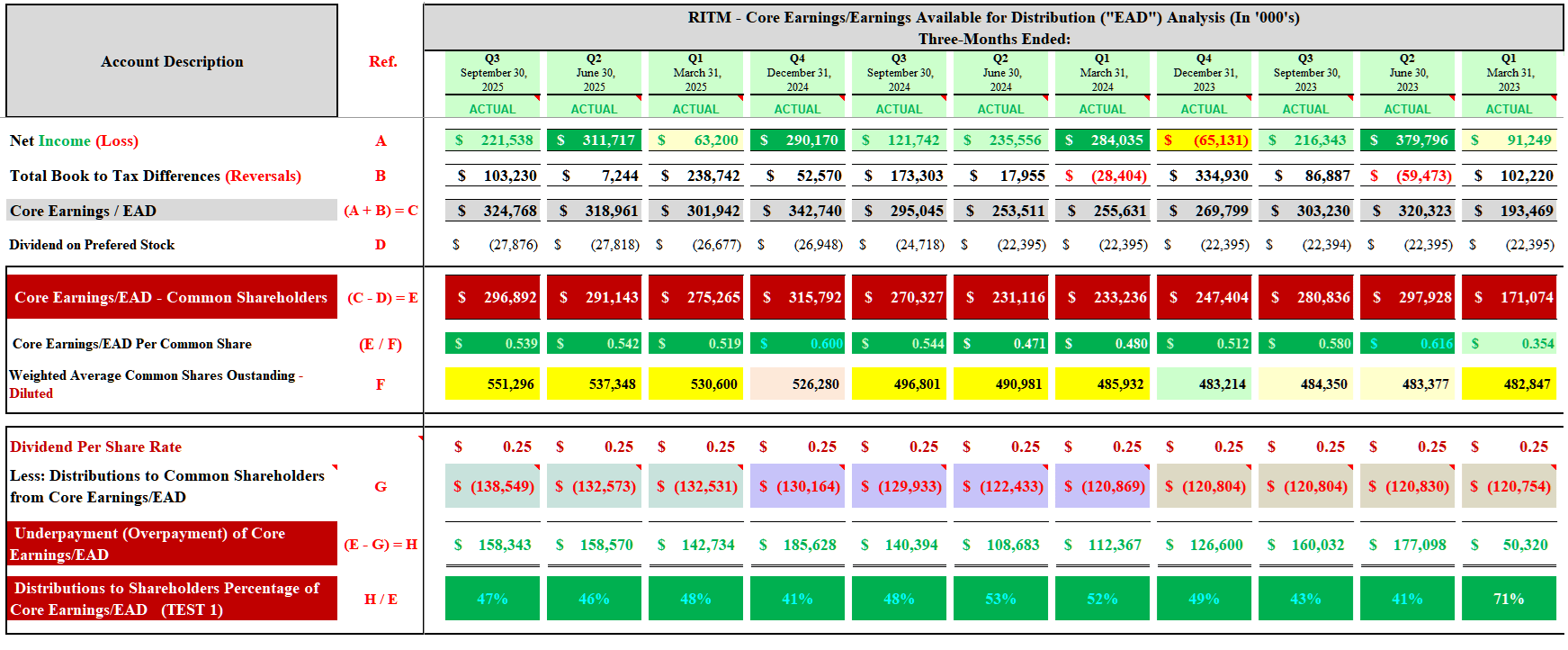 Table 12 – RITM Quarterly Core Earnings/EAD Analysis (Q1 2023 – Q3 2025)