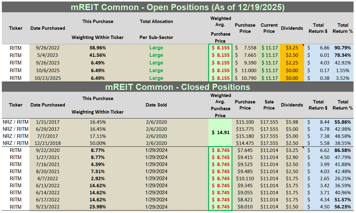 Final Note: All trades/investments I have performed over the past 8+ years have been disclosed to readers in “real time” (that day at the latest) via Seeking Alpha and, more recently, the “live chat” feature of our Investing Group (which cannot be changed/altered). Beginning in January 2020, I transitioned all my real-time purchase and sale disclosures solely to subscribers of the REIT Forum. All applicable public articles will still have my “main ticker” purchase and sale disclosures (just not real-time alerts). At the end of November 2025, I had an unrealized/realized gain “success rate” of 89.5% and a total return (includes dividends received) success rate of 95.3% out of 86 total past and present mREIT and BDC positions (updated monthly; multiple purchases/sales in one stock count as one overall position until fully closed out). I encourage other Seeking Alpha contributors to provide real-time buy and sell updates for their readers/subscribers, which would ultimately lead to greater transparency/credibility.