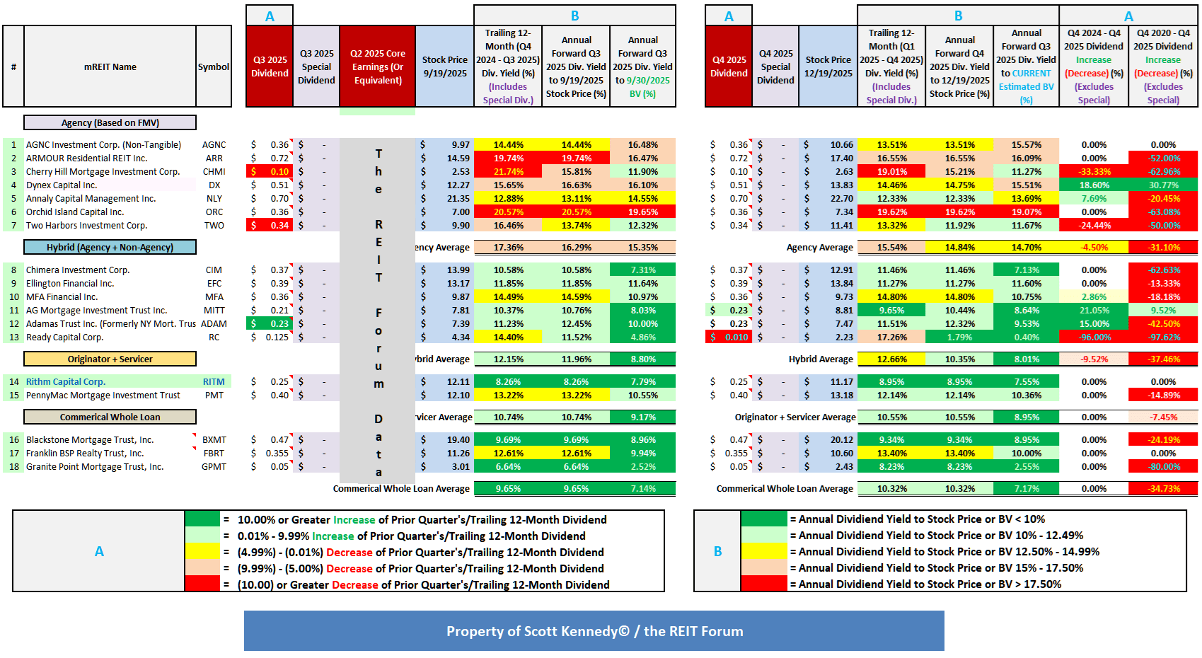 Using Table 11 above as a reference, the following information is provided (see each corresponding column): 1) dividend per share rate for Q3 2025 (for monthly dividend payers, the total monthly dividends during the quarter); 2) core earnings (or core earnings equivalent) for Q3 2025; 3) stock price as of 9/19/2025; 4) TTM dividend yield (dividend per share rate from Q4 2024 – Q3 2025); 5) annual forward dividend yield based on the dividend per share rate for Q3 2025 using the stock price as of 9/19/2025 (for monthly dividend payers, the latest monthly dividend per share rate during the quarter); 6) annual forward dividend yield based on the dividend per share rate for Q3 2025 using a BV as of 9/30/2025 (for monthly dividend payers, the latest monthly dividend per share rate during the quarter); 7) dividend per share rate for Q4 2025 (for monthly dividend payers, the total monthly dividends during the quarter); 8) stock price as of 12/19/2025; 9) TTM dividend yield (dividend per share rate from Q1 2025 – Q4 2025); 10) annual forward dividend yield based on the dividend per share rate for Q4 2025 using the stock price as of 12/19/2025 (for monthly dividend payers, the latest monthly dividend per share rate during the quarter); 11) annual forward dividend yield based on the dividend per share rate for Q4 2025 using estimated CURRENT BV (BV as of 12/19/2025) (for monthly dividend payers, the latest monthly dividend per share rate during the quarter); 12) dividend per share rate for Q4 2025 versus the Q4 2024 (percentage fluctuation); and 13) dividend per share rate for Q4 2025 versus Q4 2021 (percentage fluctuation; shows post-COVID-19 and interest rate/yield impact to each company‘s dividend).