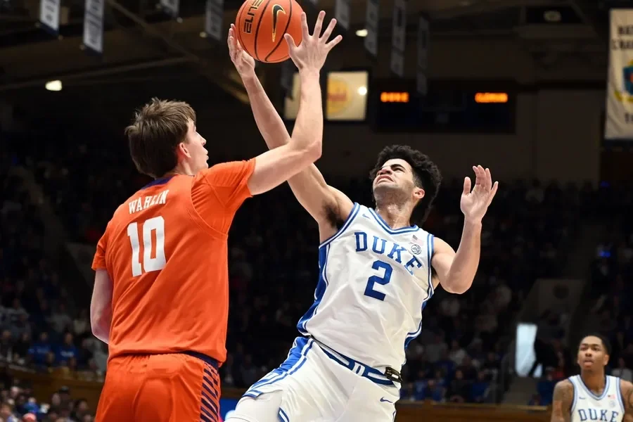 Feb 14, 2026; Durham, North Carolina, USA; Duke Blue Devils guard Cayden Boozer (2) lays the ball up over Clemson Tigers forward Jake Whalin (10) during...