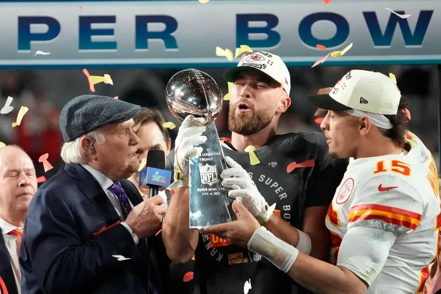 Super Bowl 57: Kansas City Chiefs quarterback Patrick Mahomes passes the the Lombardi Trophy to Travis Kelce after winning the Super Bowl against the Philadelphia Eagles...