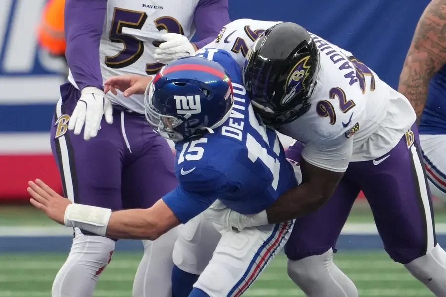 Dec 15, 2024; East Rutherford, New Jersey, USA; Baltimore Ravens defensive tackle Nnamdi Madubuike (92) is flagged for roughing the passer on New York Giants quarterback...