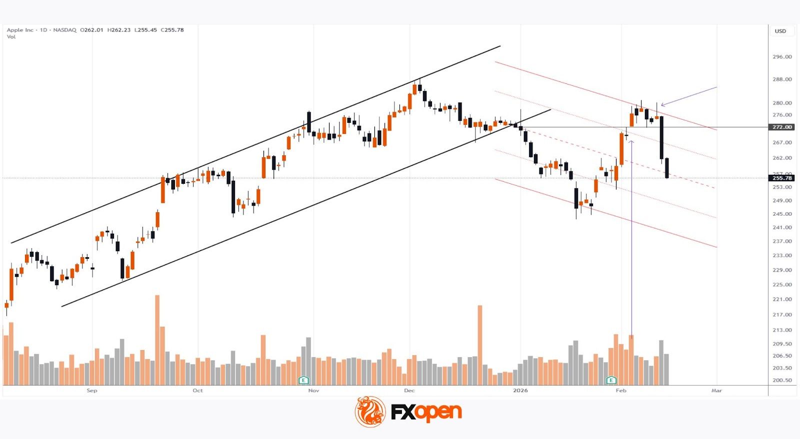 At the start of 2026, AAPL shares broke below an ascending channel (shown in black) near the $272 level. Price and volume dynamics suggest this area has become a zone where bears are active and gaining the upper hand.