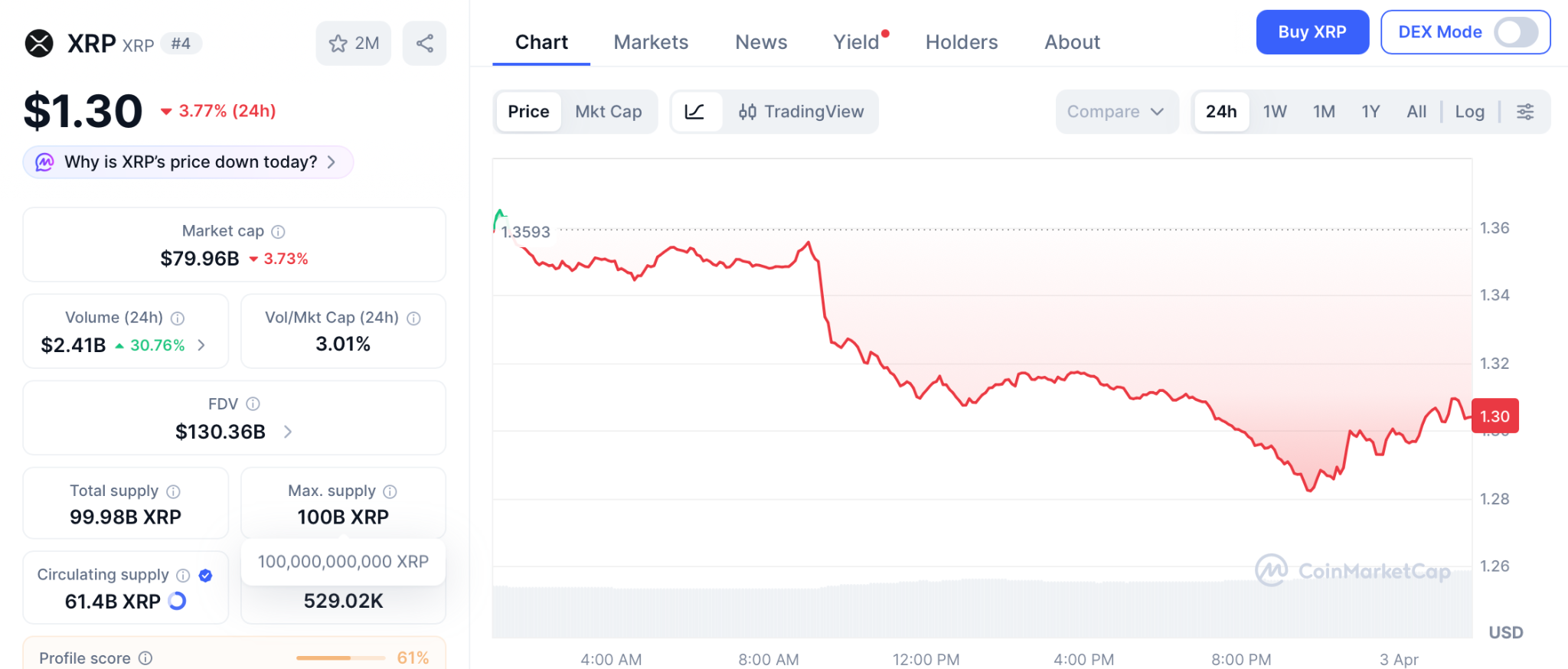 XRP is trading near $1.30 after pulling back from $1.50 earlier this month according to CoinMarketCap, holding a commodity classification from both the SEC and CFTC along with seven live ETFs that pulled $1.44 billion in inflows.