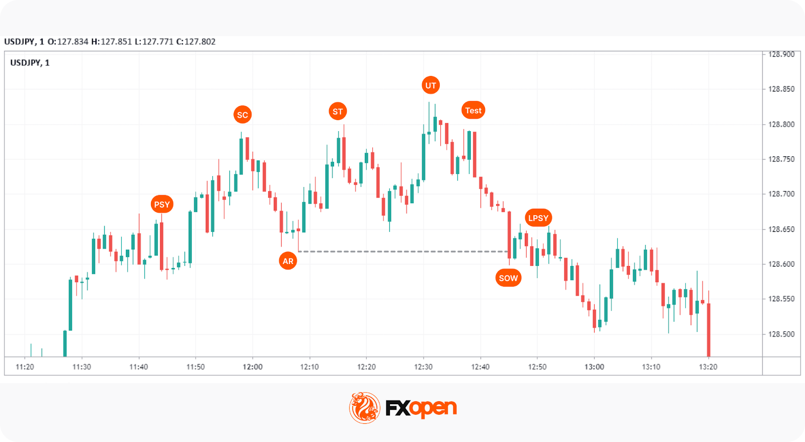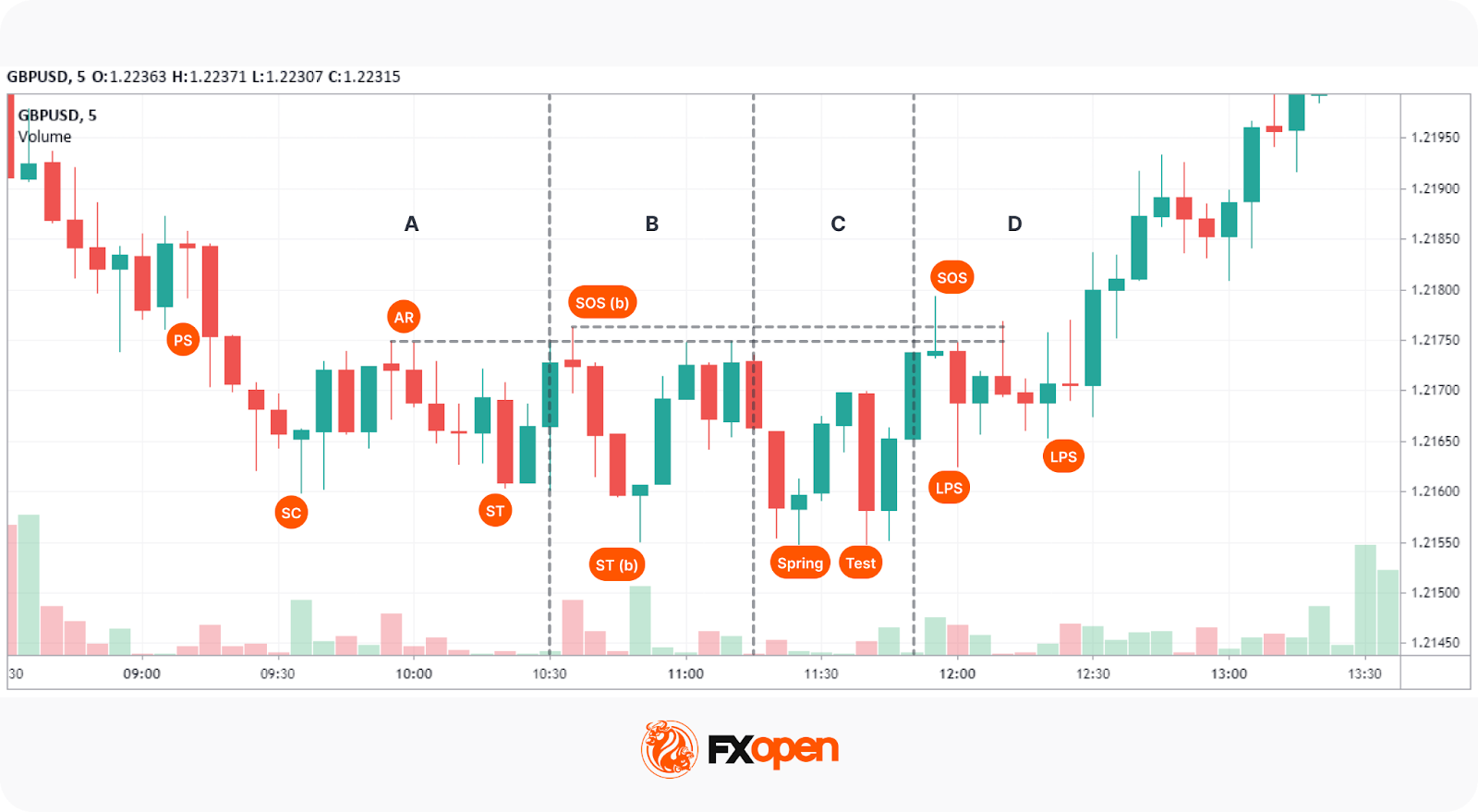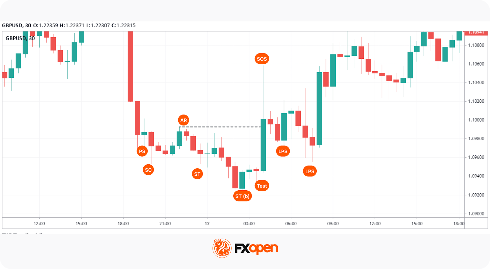These cycles can be identified using standard Wyckoff chart patterns based on price and volume behaviour. If you want to test your own understanding, you may use the TickTrader platform with us at FXOpen.