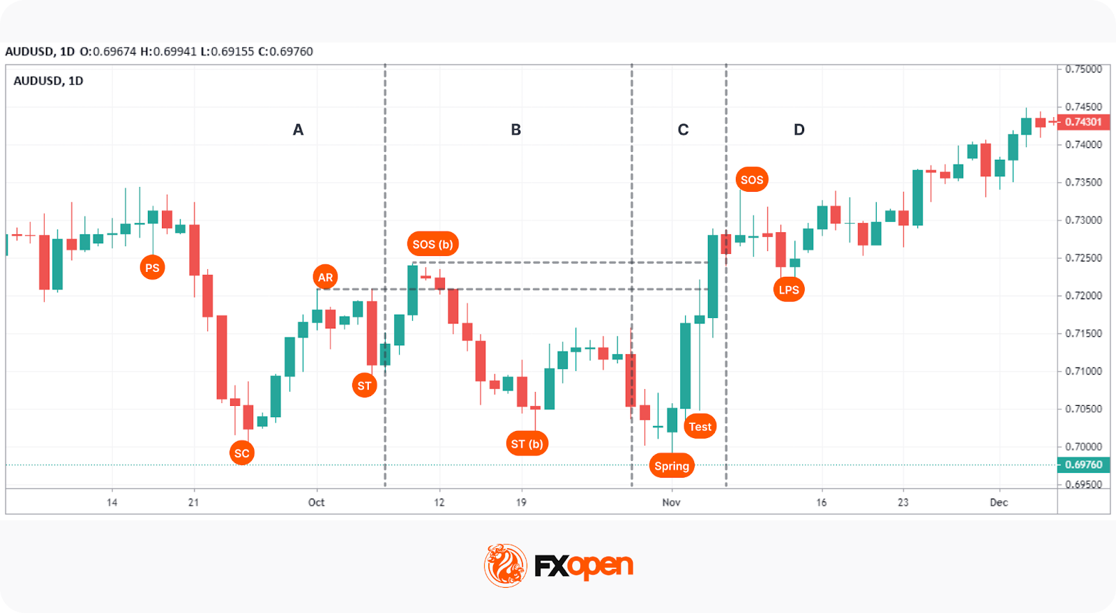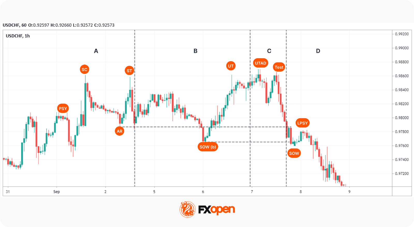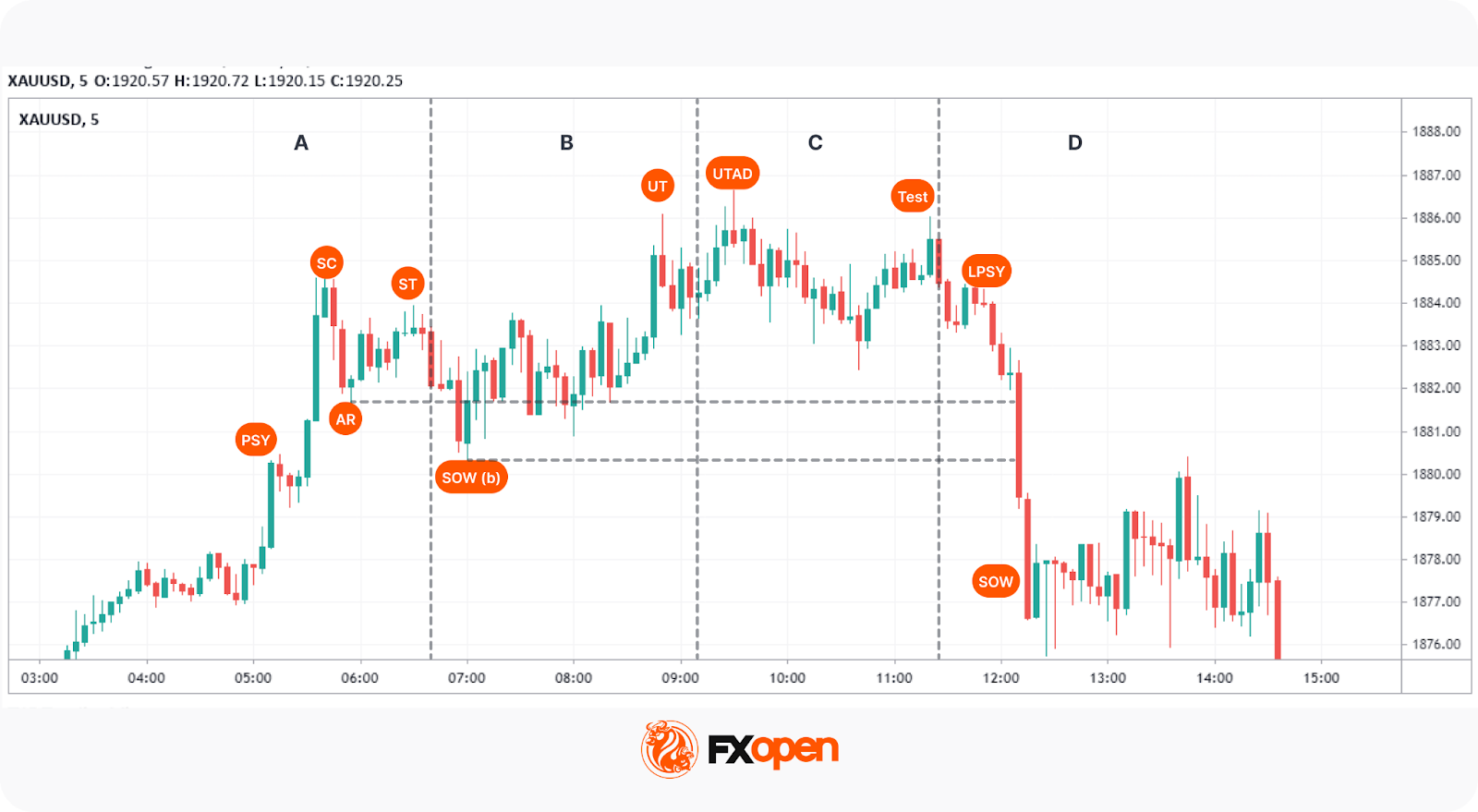 These cycles can be identified using standard Wyckoff chart patterns based on price and volume behaviour. If you want to test your own understanding, you may use the TickTrader platform with us at FXOpen.