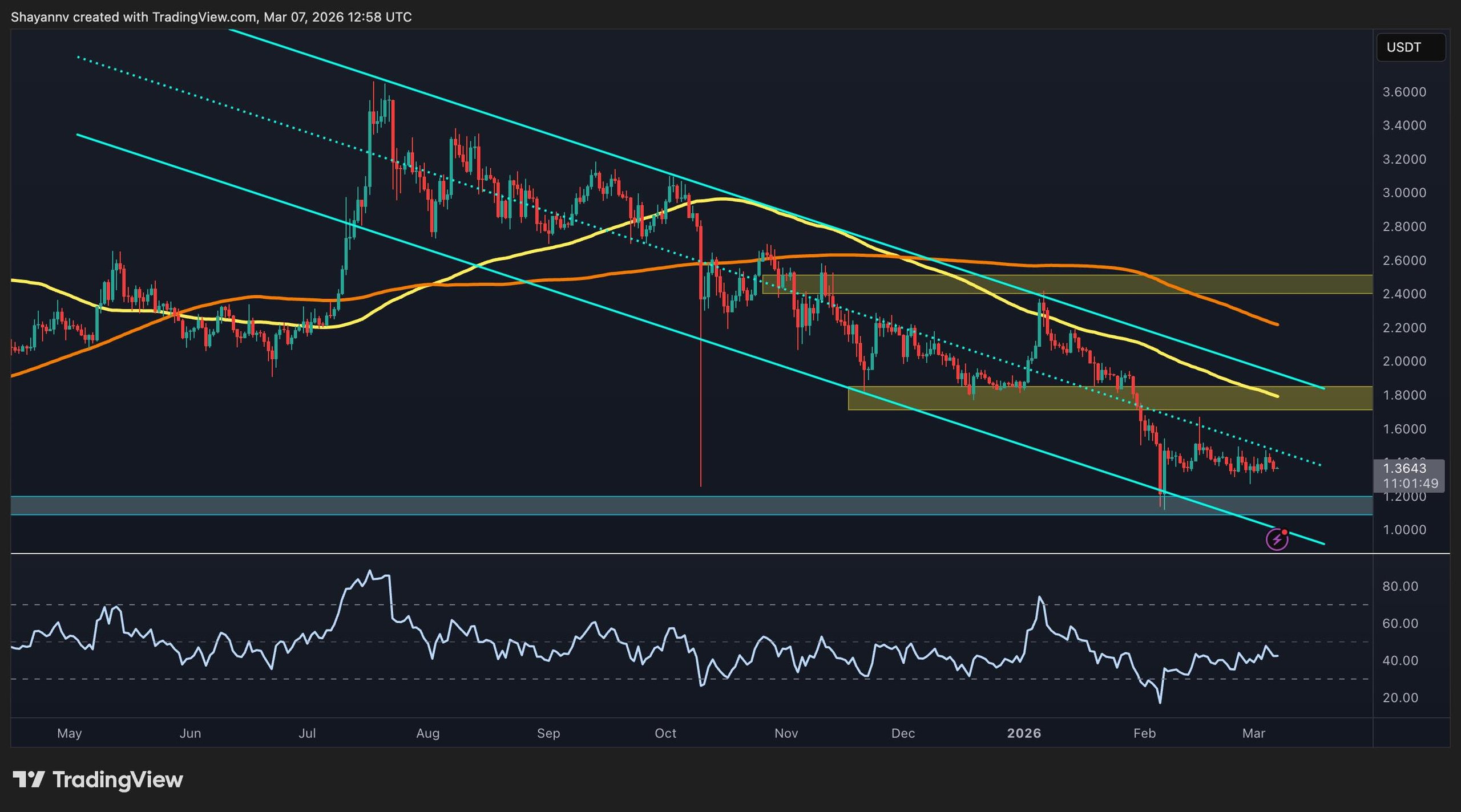 XRP holds at $1.36 according to CoinMarketCap with $1.24 billion in cumulative ETF inflows. Standard Chartered targets $8, but at $85 billion market cap even that target is a 5.6x that takes the full year.