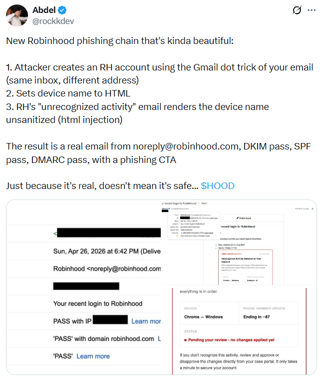 Robinhood users are being warned about a new phishing attack that takes advantage of Gmail’s native “dot alias” feature and flaws in Robinhood’s account creation process to send malicious emails.