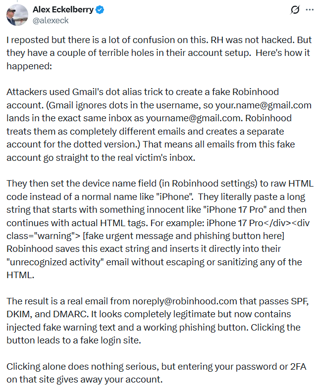While Robinhood would treat them as completely separate accounts, Gmail ignores dots in the username part of an email address. This means scammers could prompt Robinhood to automatically send emails intended for their fake account, but have them arrive in their target’s inbox instead.