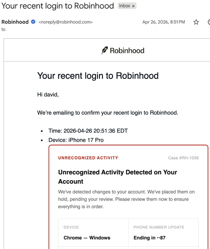 Robinhood users on Sunday began reporting on social media of emails originating from the platform’s mail server warning of an unrecognized device login, which linked to phishing websites in the “call to action” button.