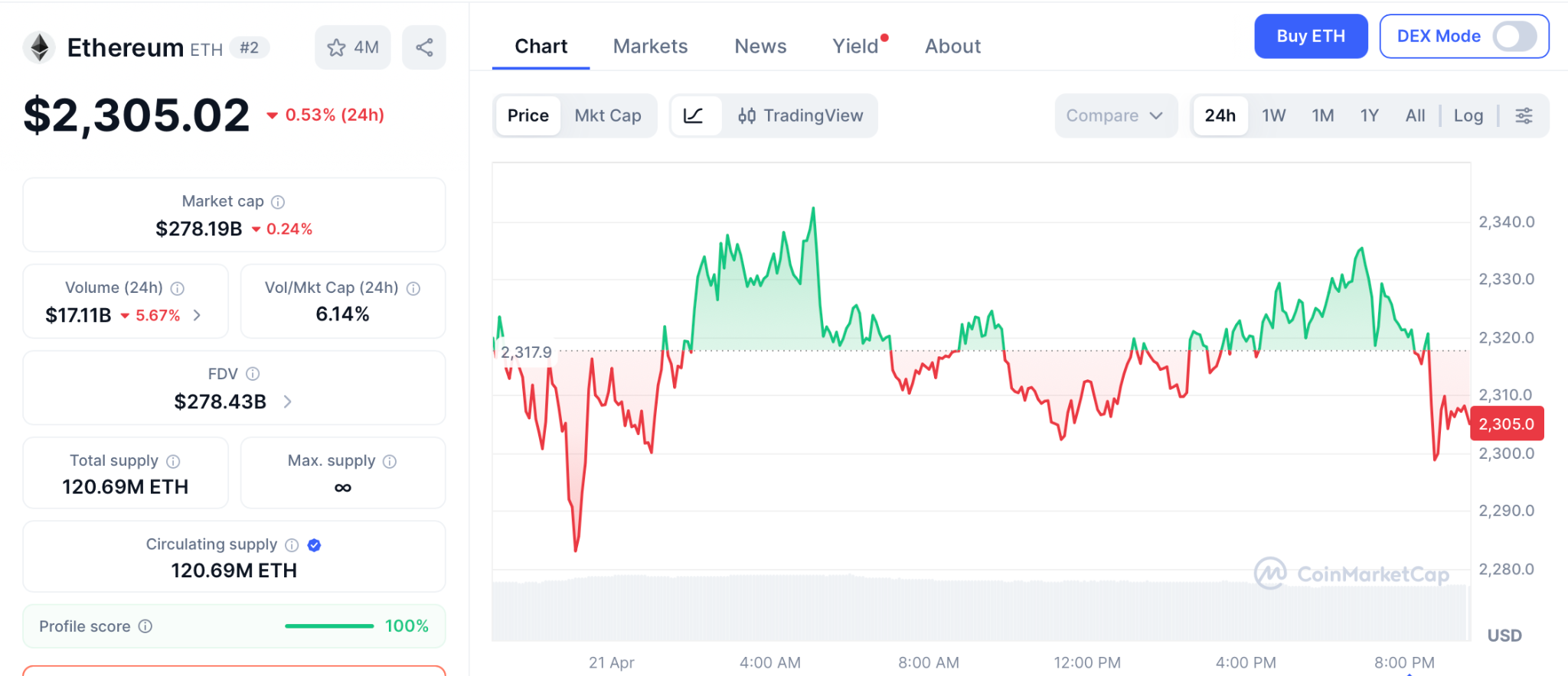 Ethereum (ETH) trades at $2,305 on April 21, up from $2,078 at the start of the month, according to CoinMarketCap. A $90.9 million 20x leveraged long position was opened against ETH on April 20, indicating strong whale conviction in the ascending triangle setup.