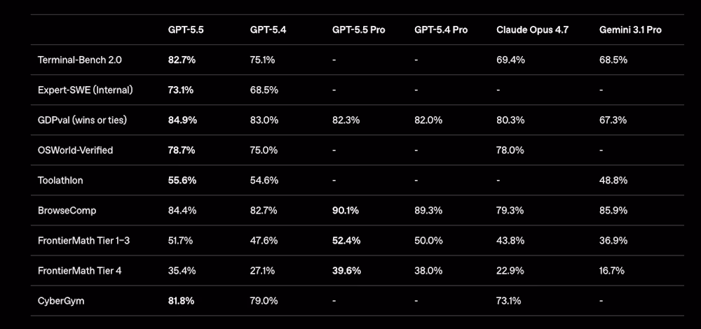 OpenAI’s own benchmarks show GPT-5.5 ahead of Claude Opus 4.7 on several agentic tasks. It scored 82.7% on Terminal-Bench 2.0, compared to 69.4% for Opus 4.7.