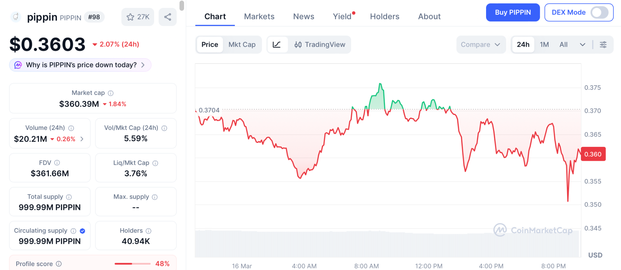PIPPIN trades at $0.36 according to CoinMarketCap on March 16 with a market cap near $360 million. Created by the mind behind BabyAGI, the project gained over 150% in a recent rally.
