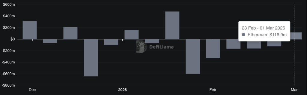 The gains mark two consecutive days of inflows, hinting at a possible upside following a massive February sell-off that wiped out $20 billion in net assets.