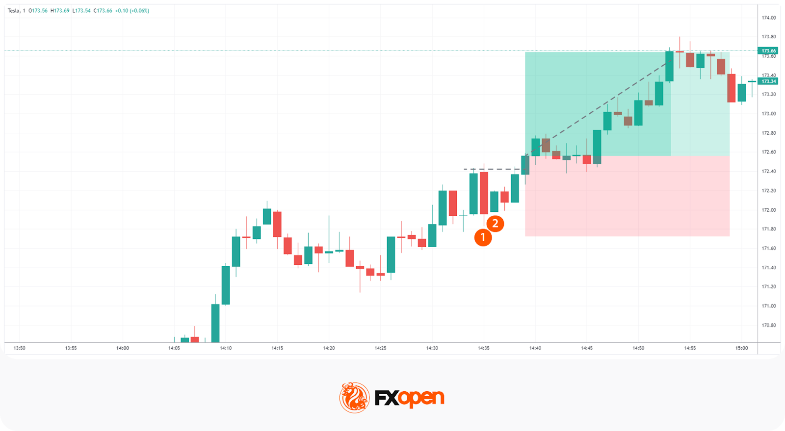 Below, we provide an example of an inside bar breakout strategy with a bullish inside bar stock pattern on a Tesla chart. This setup represents a typical bullish continuation pattern, where the breakout is confirmed by candles closing above the mother bar’s high and holding above a nearby resistance level.