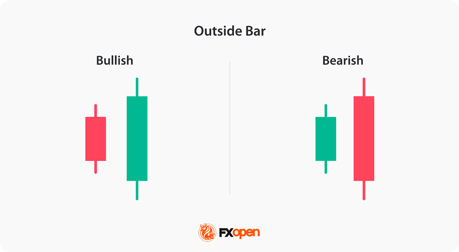On the other hand, an outside bar—often considered a form of engulfing pattern—appears when a candlestick completely exceeds the previous candle’s high–low range. As Al Brooks defines it in his Trading Price Action Trends, an outside bar occurs when “the high of the current bar is above the high of the previous bar and the low is below the low of the previous bar,” reflecting increased participation from both buyers and sellers. A bearish outside setup typically forms near the top of an uptrend and may signal a downward reversal, while a bullish outside setup forms near the bottom of a downtrend and may suggest an upward reversal.
