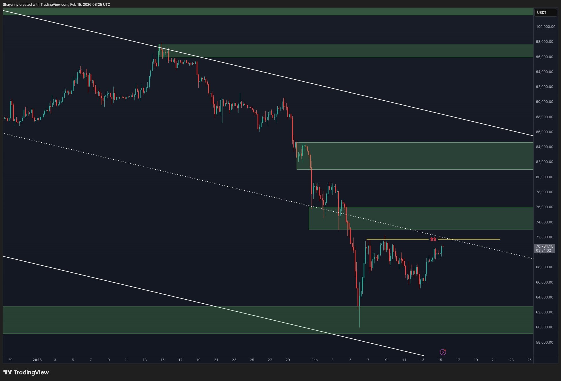 If selling pressure accelerates further, Bitcoin could fall toward the $55,620 zone, which aligns with the deeper projection of the bear flag structure. On the upside, Bitcoin must reclaim $70,840 to stabilize in the short term.