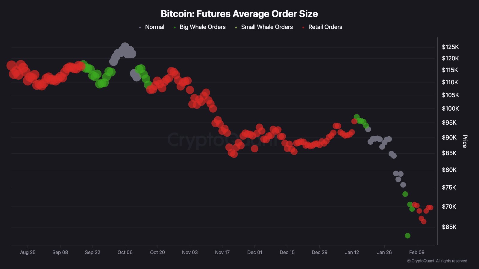 The Bitcoin Futures Average Order Size chart reveals a notable shift during the recent decline. As the asset approached the $60,000–$65,000 region, several green dots appeared, representing large whale-sized orders entering the market. This cluster of green dots near the local bottom suggests that larger participants began accumulating during the panic-driven sell-off.