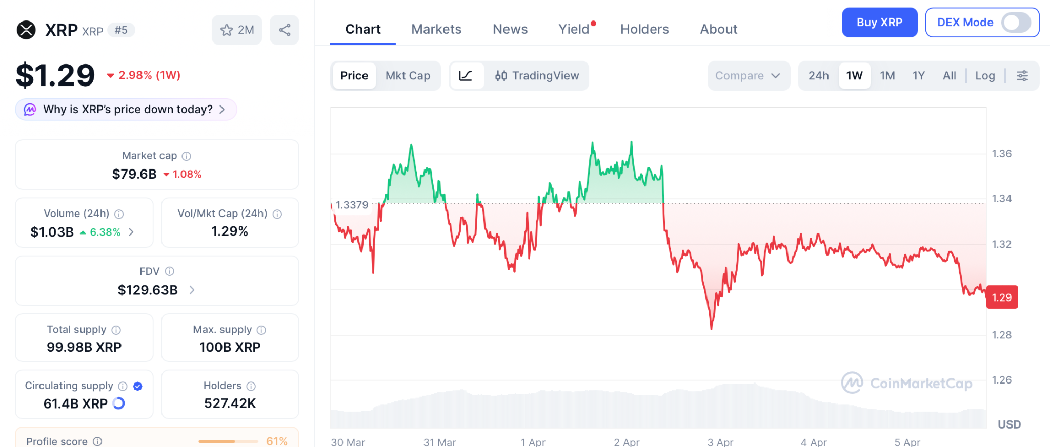XRP trades at $1.29 per CoinMarketCap, drifting below key moving averages as sellers stay in control.
