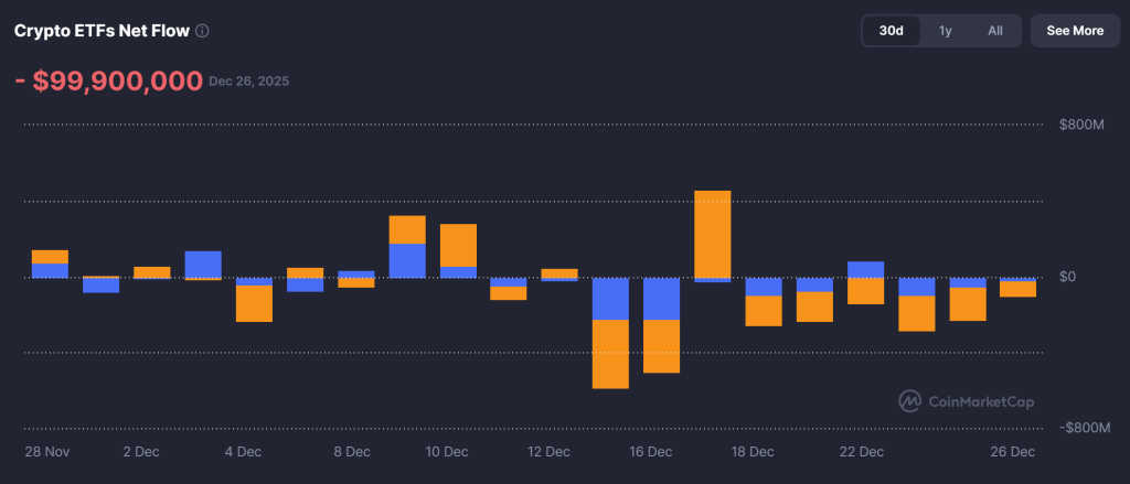 The market is on edge. The crypto fear & greed index is stuck in fear, and we’ve just seen a $99.9 million net outflow in recent ETF flow data, which only adds to short-term risk aversion.