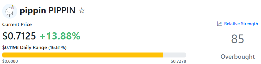 PIPPIN spiked by 20%, briefly exceeding $0.72 before stabilizing at around $0.71 (per CoinGecko’s data). Its market capitalization once again surpassed $700 million, bringing the asset back into the top 100 cryptocurrencies. As of press time, PIPPIN is the 81st-largest in the entire market and ranks seventh in the meme coin niche.