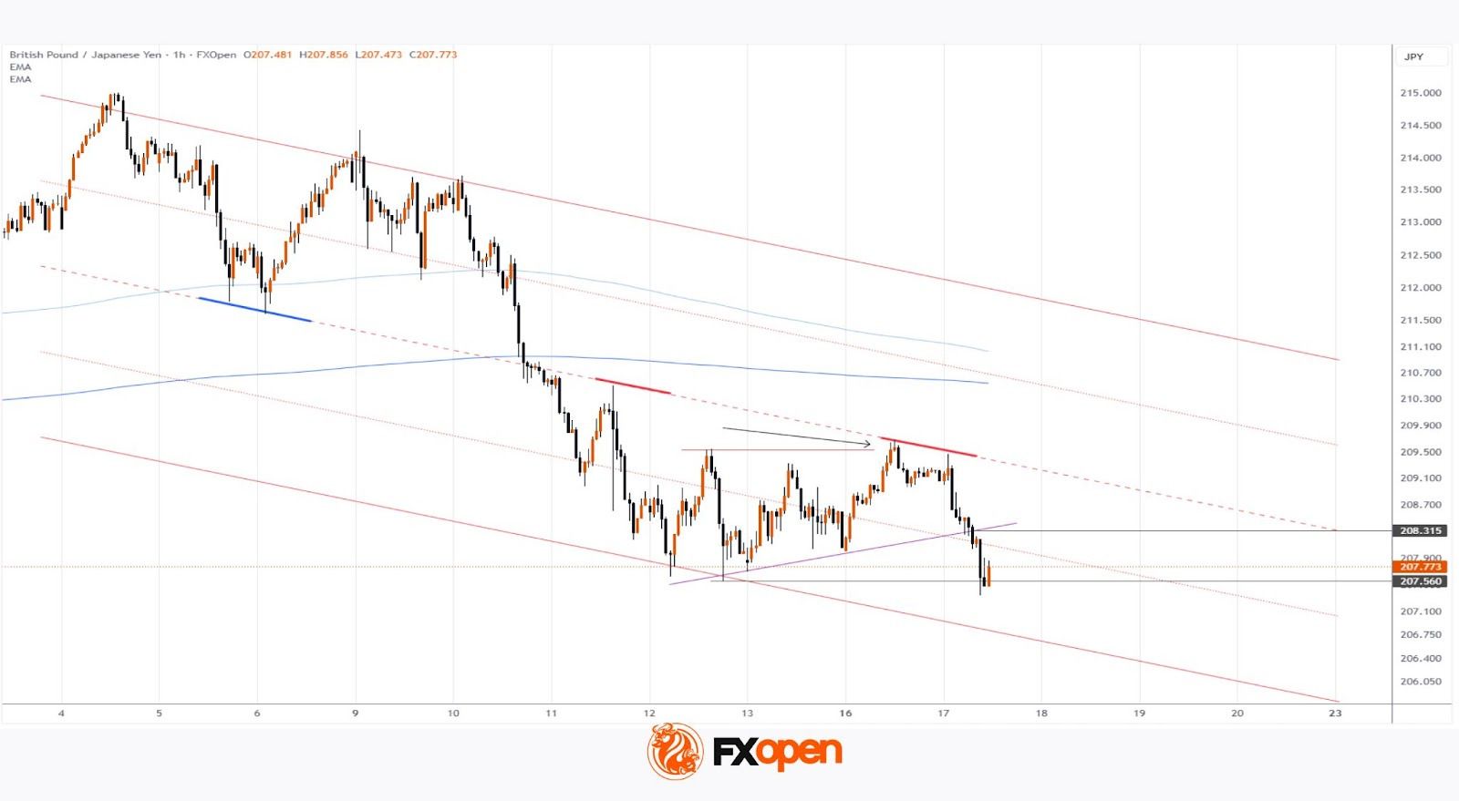 Nevertheless, the outlook for bulls remains challenging. Even if they manage to push prices slightly higher, they may encounter resistance around 208.315 — a level where sellers previously demonstrated strength when breaking local support (shown in purple).
