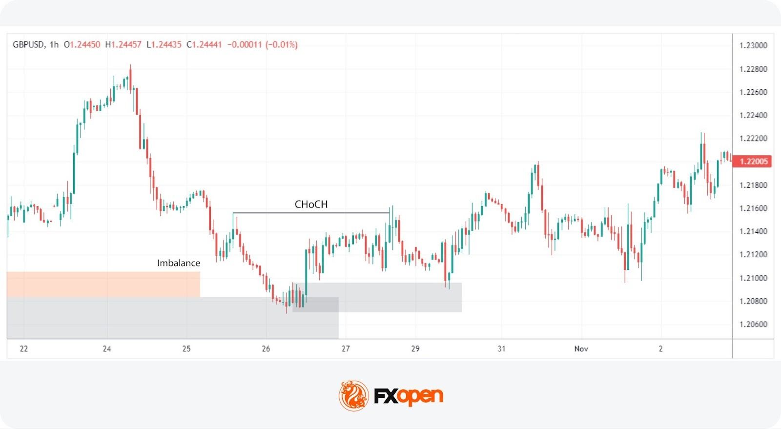 In practice, traders can look for a sequence where the price first approaches an order block and begins to fill any existing imbalances. This setup increases confidence in a potential reversal. As the price meets these criteria and a CHoCH occurs, this indicates that the influence of the order block is likely to initiate a price reversal.