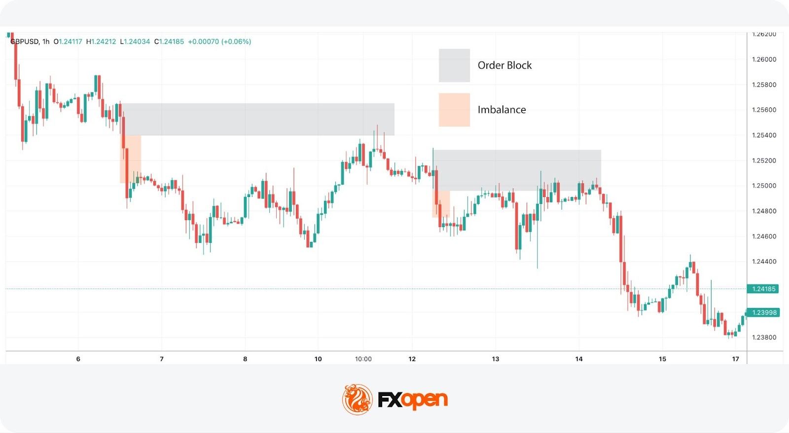 Consider the 4-hour chart of the GBP/USD pair above. We see the pair encounter an order block on the left, one that’s visible on the daily chart. As the price interacts with this block, it begins to retrace, attempting to fill the imbalance but moves away. Eventually, the price completes the fill of the imbalance and meets the previously established order block.