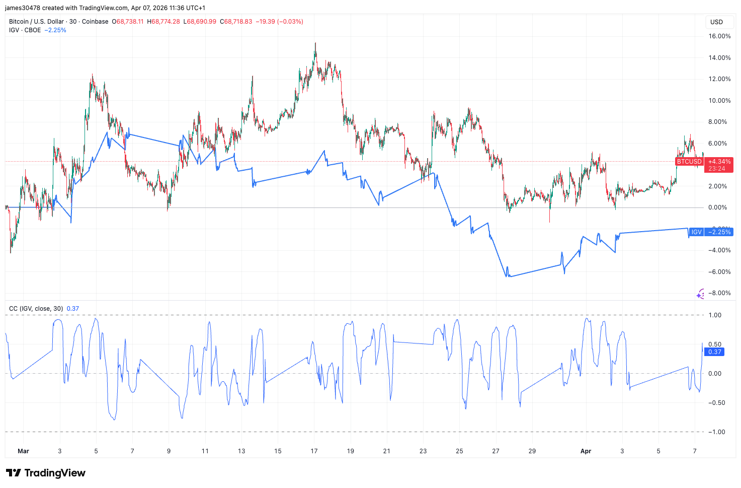 IGV, in contrast, has fallen more than 2% since the conflict began. That gap suggests investors are starting to treat bitcoin and software stocks differently, at least in the near term.