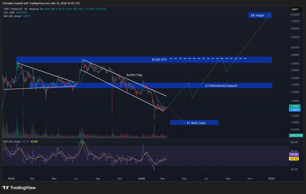XRP trades near $1.45 today, with Alibaba AI predicting a surge as high as $8 by year-end, delivering 5.5x returns for those holding positions if it plays out.