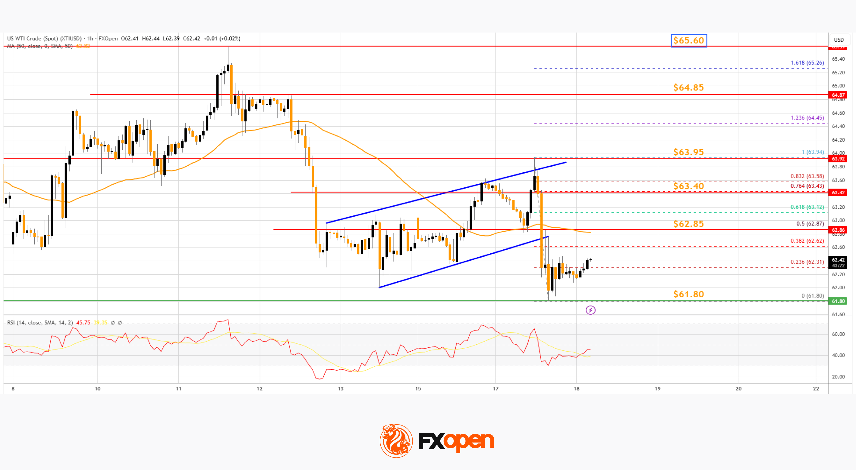 · It dipped below a rising channel with support at $62.85 on the hourly chart of XTI/USD at FXOpen.