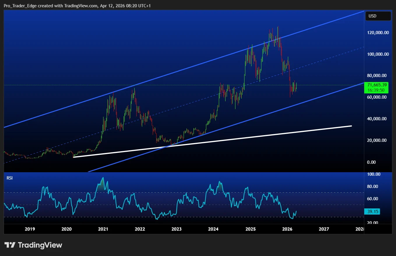 However, weekly chart technicals indicate this cycle might deviate from that trajectory. The long-term ascending channel structure remains unbroken. The present price action appears more consistent with a rejection near the upper boundary of this formation rather than a complete structural collapse into multi-year bearish territory.