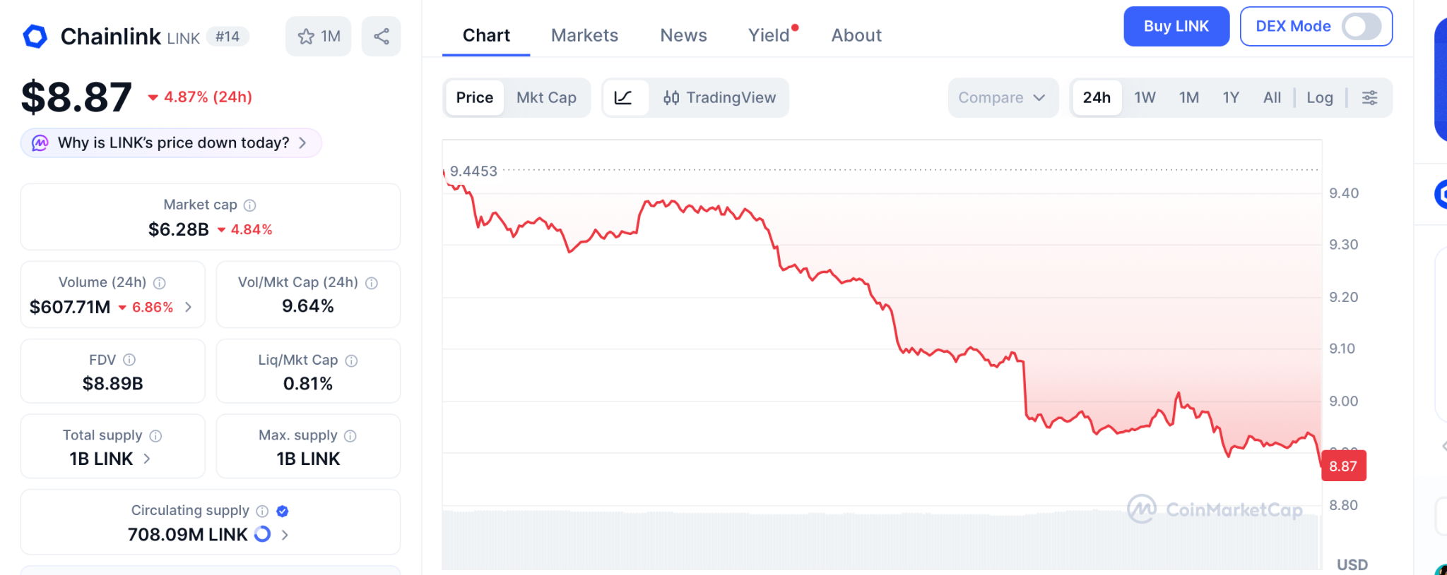 Chainlink trades near $8.87 as of March 27 with the CCIP cross chain protocol expanding and the SEC commodity classification confirmed, according to CoinMarketCap.