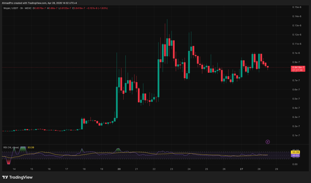 Zooming in on the 4-hour chart sharpens the near-term picture. Price is pressing toward $0.090, but the 4-hour RSI has rolled over and is printing a lower high relative to the latest peak.