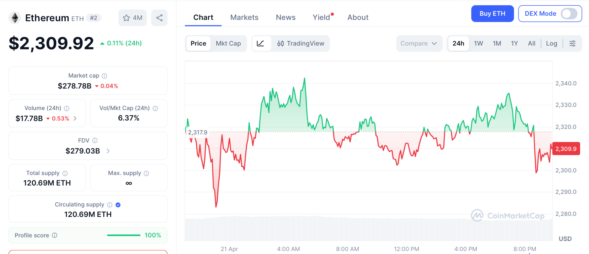 Ethereum (ETH) trades at $2,309 on April 21 per CoinMarketCap, up 0.11% on the day after riding the Iran ceasefire rally higher. The Fear and Greed Index sits below 20, historically the zone where patient capital loads rather than sells.