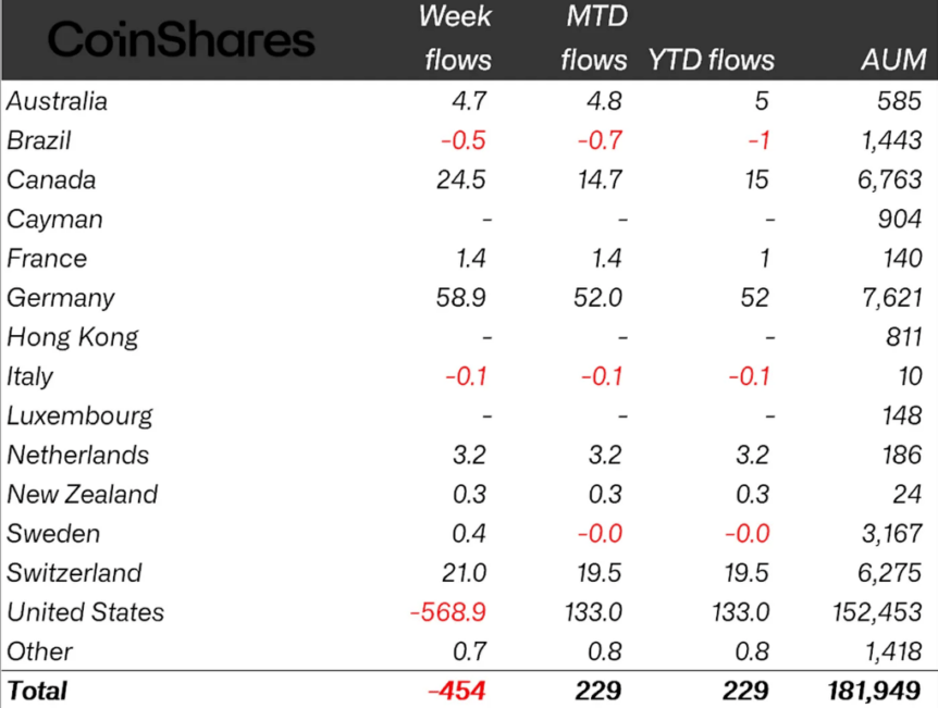 Regionally, the United States was the only major market to exhibit significant outflows, totaling $569 million. Conversely, Germany, Canada, and Switzerland registered inflows of $59 million, $25 million, and $21 million, respectively. Despite these shifts, total assets under management across crypto ETPs slightly increased week-over-week to $181.9 billion from $181.3 billion.