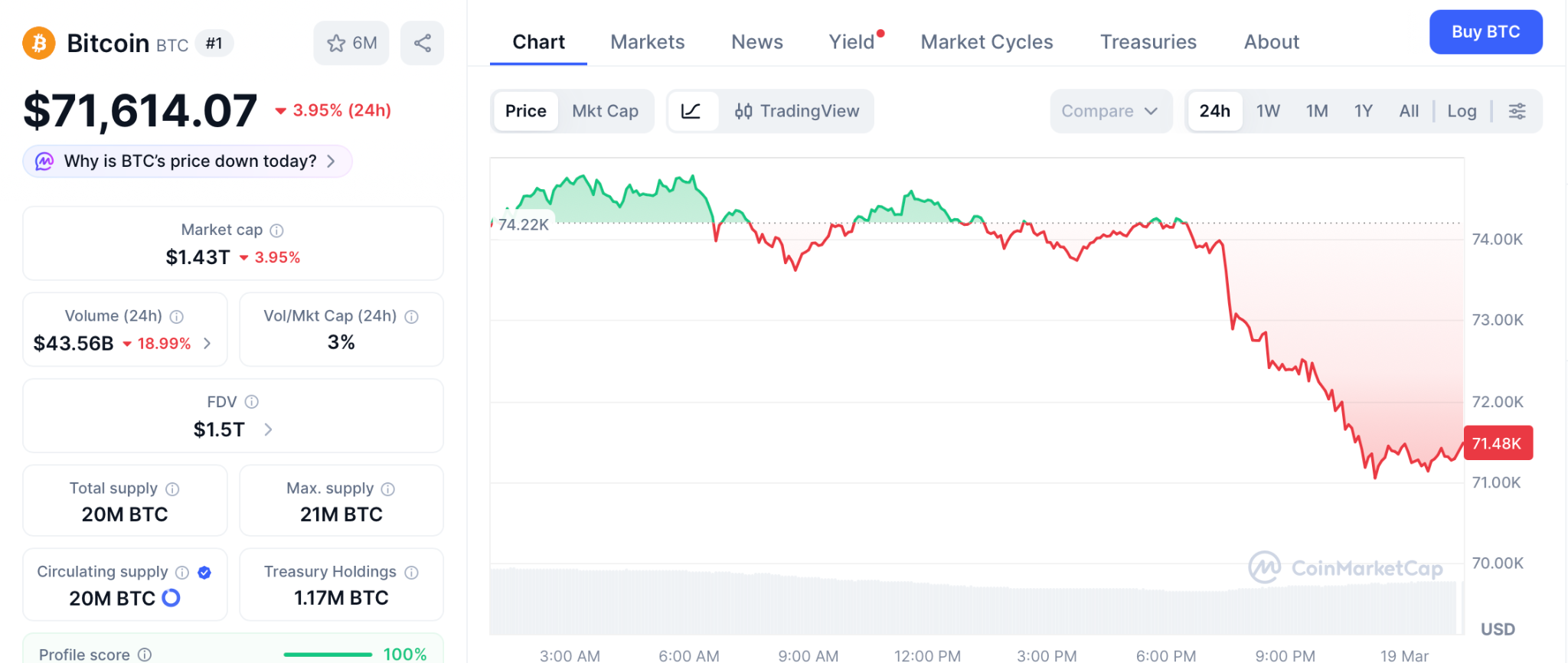 Bitcoin (BTC) is trading at around $71,300, down nearly 5% over the past 24 hours. ETH and SOL fell 6% to $2,190 and $90, respectively.