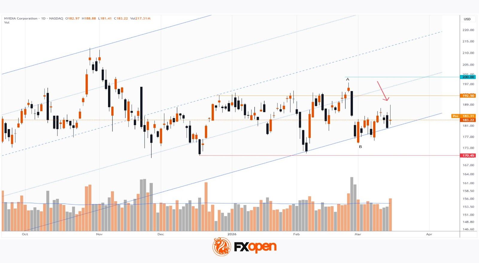 As the NVDA chart shows, the share price rose above the $188.50 level, but later pulled back, which may suggest excessive optimism among buyers and aggressive selling pressure.